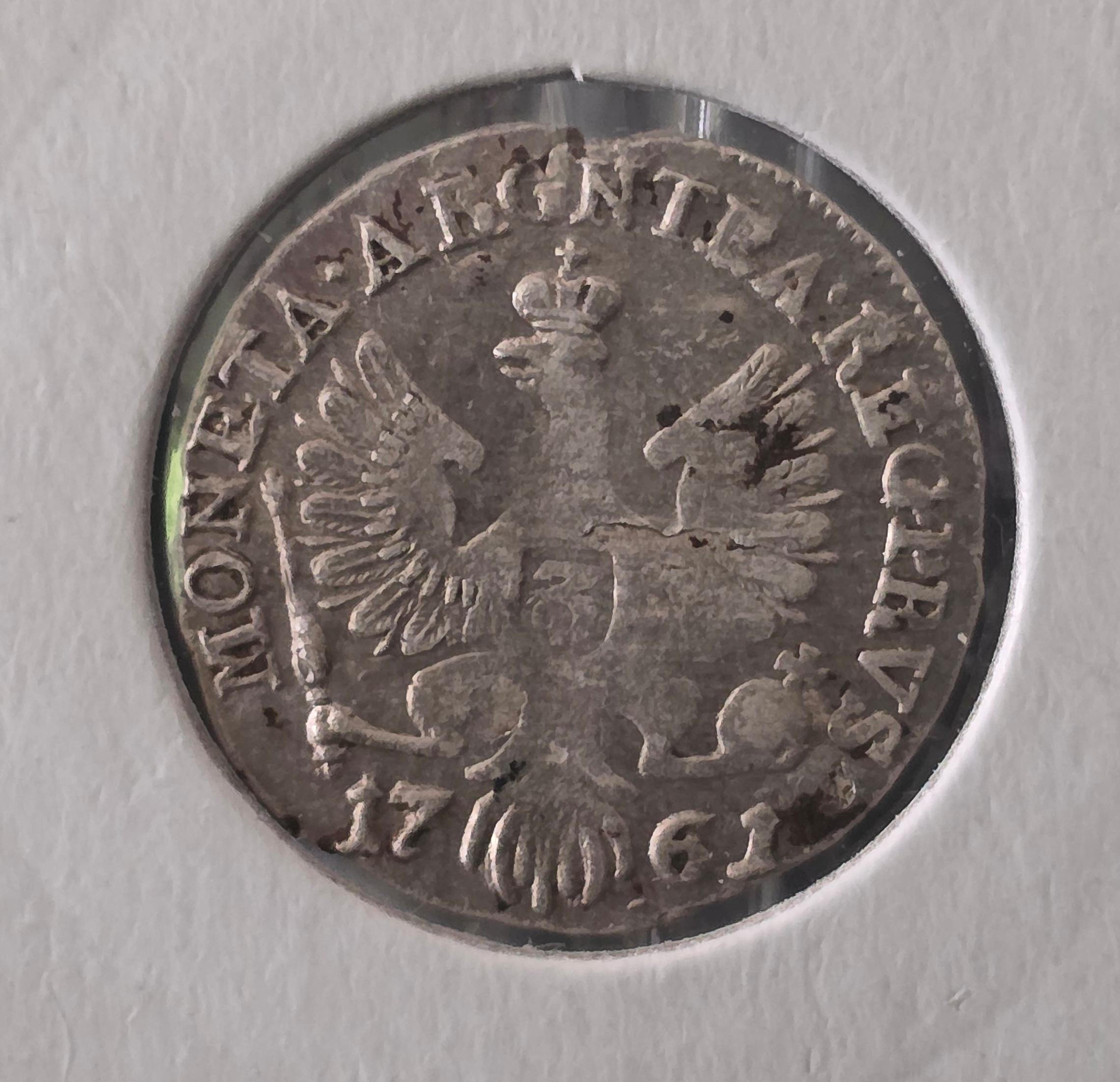 Opisując wydarzenia wojenne i tło historyczne, zwróciliśmy uwagę na tzw. „efraimki”. Czy mamy z nimi do czynienia również tutaj…? Znalezione w tym samym miejscu monety z wizerunkiem Augusta III mogą, choć oczywiście nie muszą, pochodzić z produkcji skradzionymi stemplami. Niemniej jednak na uwagę zasługuje wiele innych monet, bardzo cennych, jak np. dosyć rzadki trojak carycy Elżbiety, bity w Królewcu przez Rosjan dla okupowanych terenów Prus podczas wojny siedmioletniej, polsko-saksoński grosz bity w Dreźnie, czy też moneta – szeląg gdański Augusta III Sasa, czy też VI część talara Adolfa Fryderyka – króla Szwecji z 1761 roku: